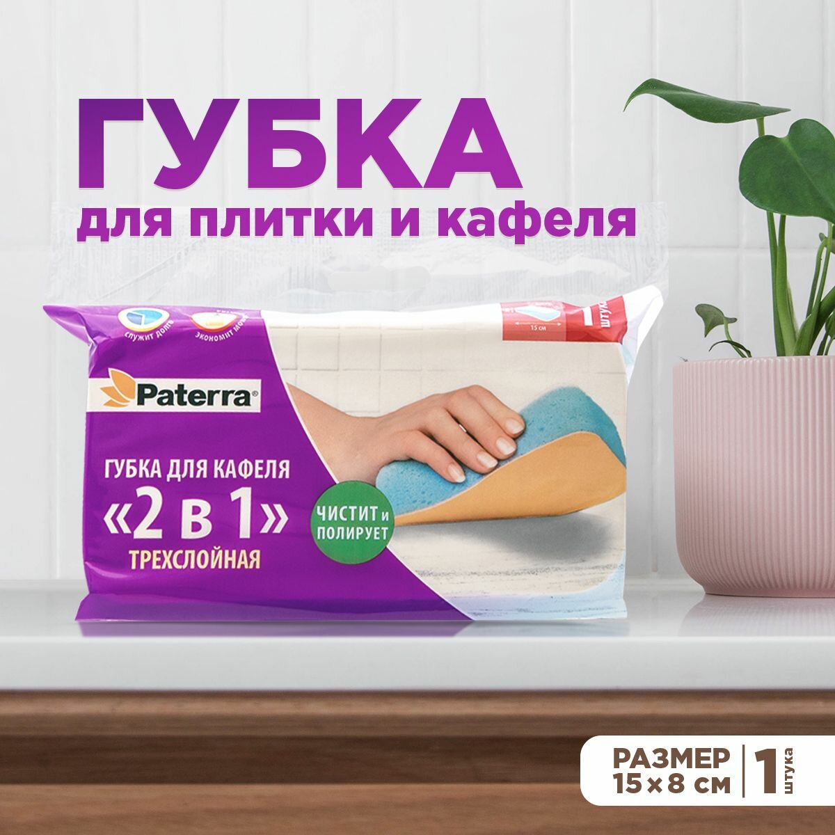 Губка для кафеля Paterra 2 в 1, трехслойная, 1 шт