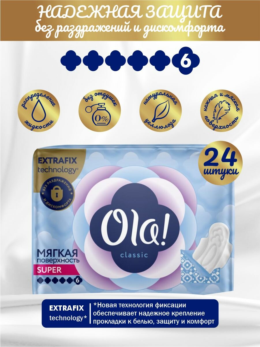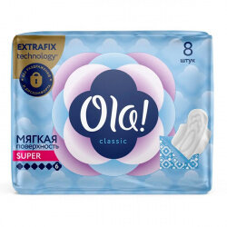 Прокладки Ola / Ола женские гигиенические Classic супер 6 капель впитывающие с крылышками, пачка 8шт. / женская гигиена