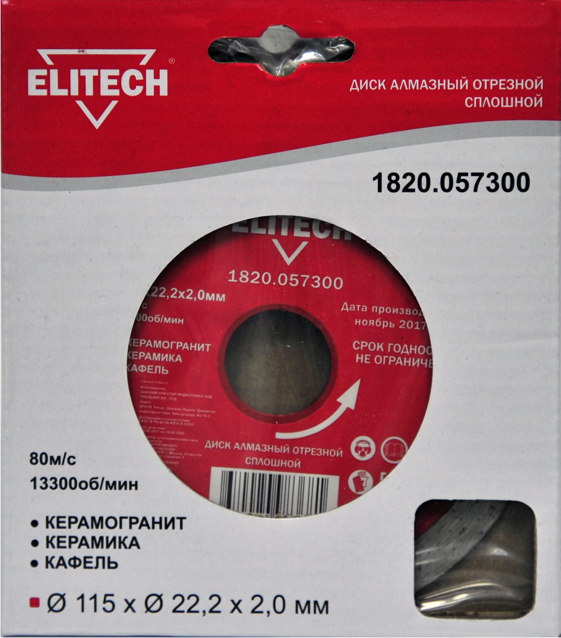 Elitech Диск алмазный 115x2.0x22,23 мм Elitech 1820.057300, сплошной, для плитки/керамики