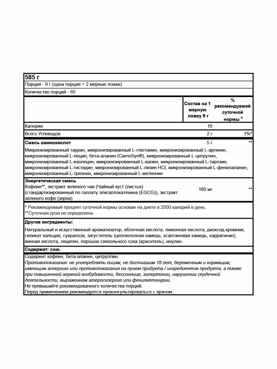 Прекрасно размешивается; Эффективность, отличная комбинация бета-аланина, кофеина и аминокислот. |