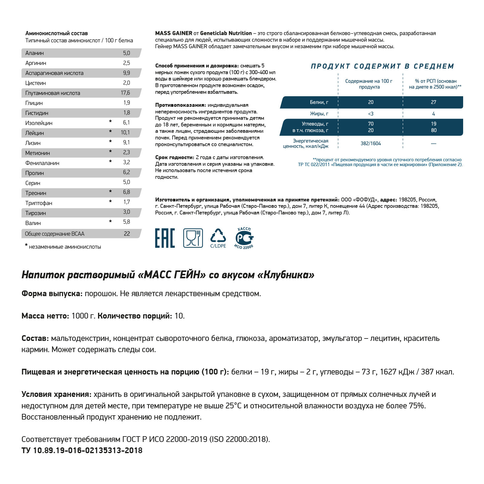 GeneticLab MASS GAINER 1000 гр (Клубника)