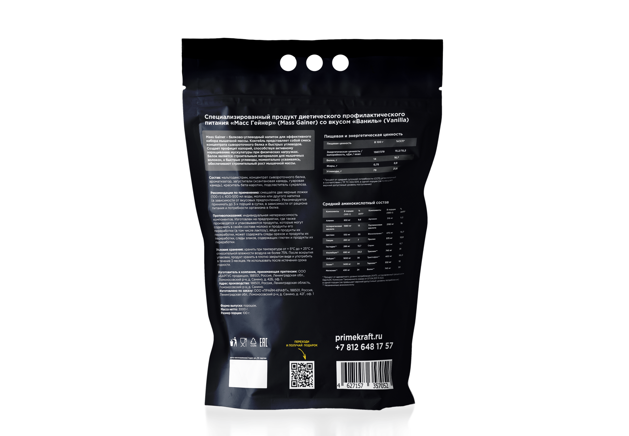 Купить Гейнер белково-углеводный Prime Kraft MASS GAINER для набора массы - Ваниль дой-пак 3000 гр