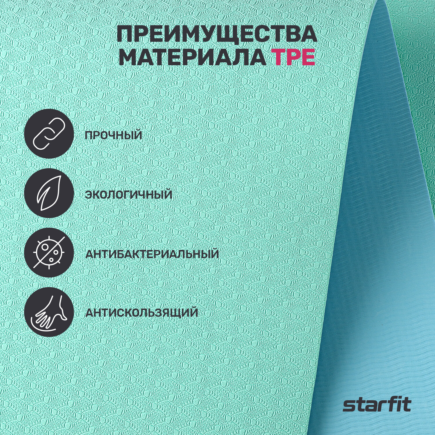 Коврик для йоги и фитнеса STARFIT FM-201, TPE, 183х61 см мятный/синий 0.4 см