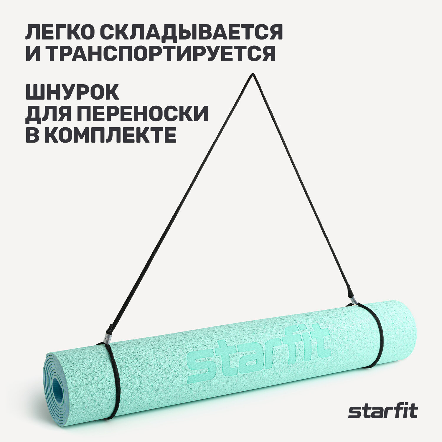 Коврик для йоги и фитнеса STARFIT FM-201, TPE, 183x61x0,4 см, мятный/синий с шнурком для переноски