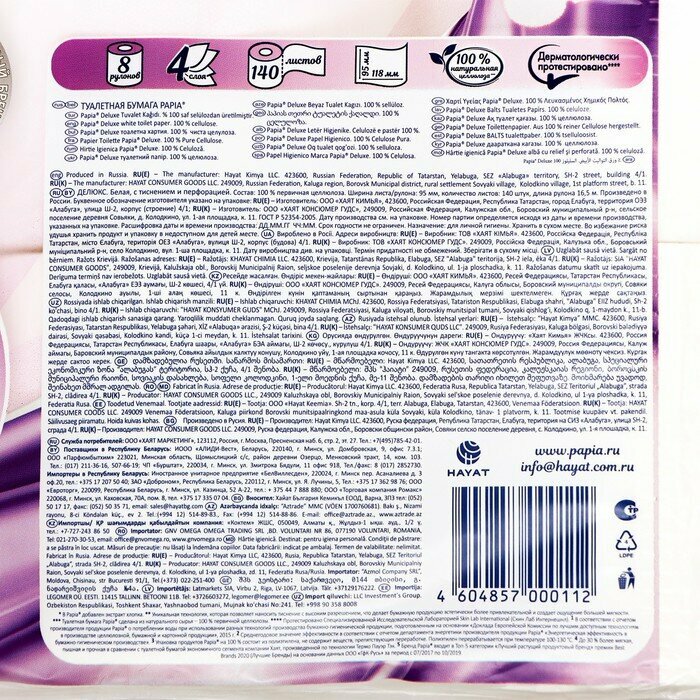 HAYAT "Papia Deluxe" Туалетная бумага белая четырёхслойная, 4 шт