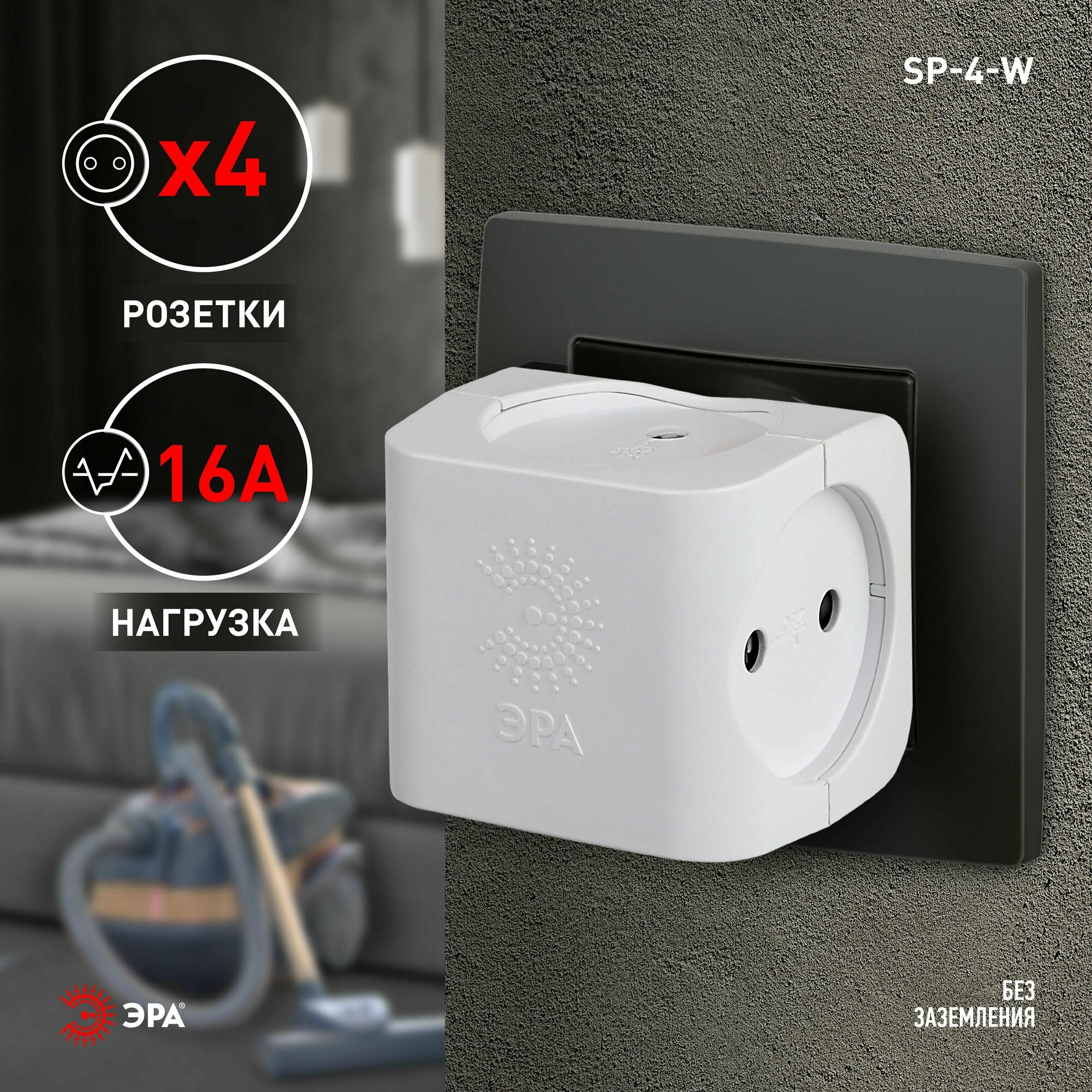 Тройник SP-4-W ЭРА / Тройник розетка электрический / Разветвитель электрический без заземления, 4 розетки, 16А, белый