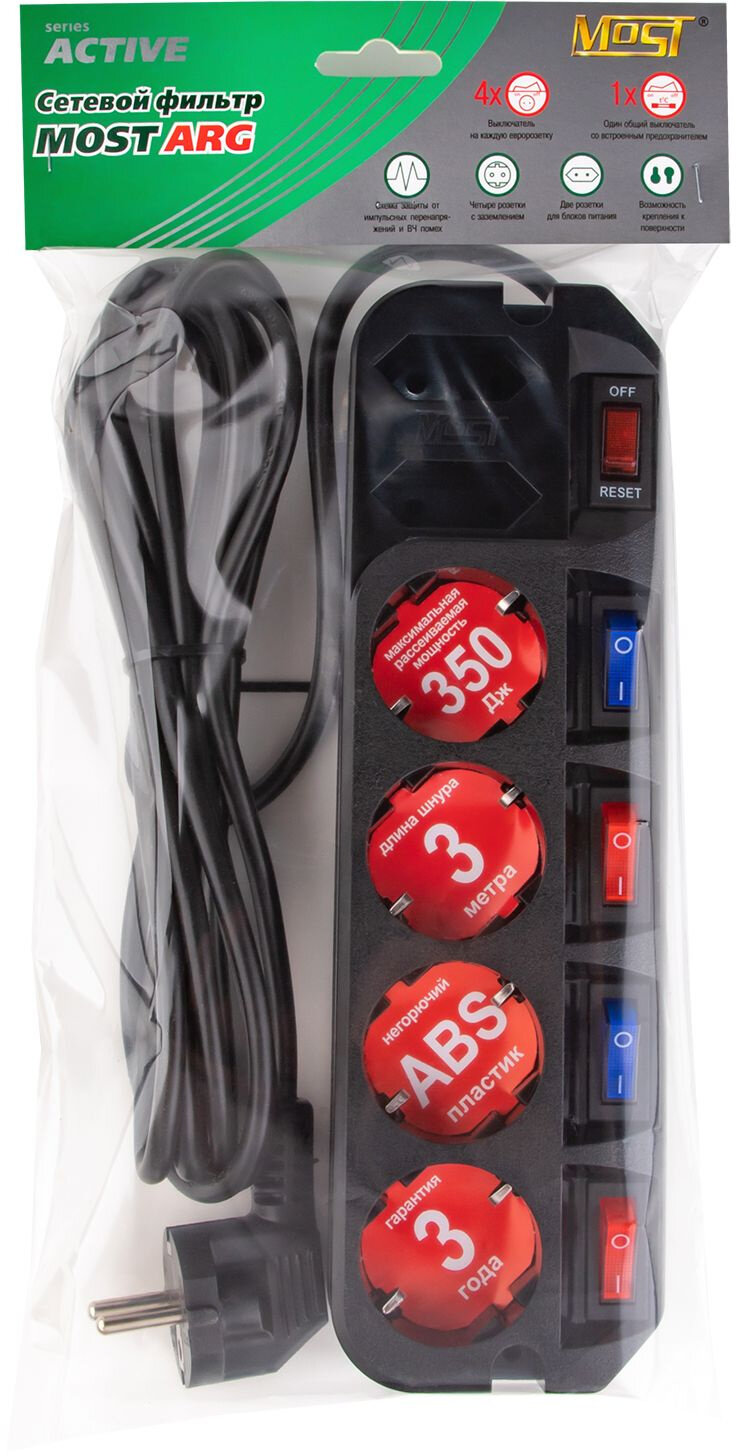 Сетевой фильтр MOST Active ARG, 6 розеток, с/з, 10А / 2200 Вт черный 3 м 250 мм 75 мм 60 мм 6
