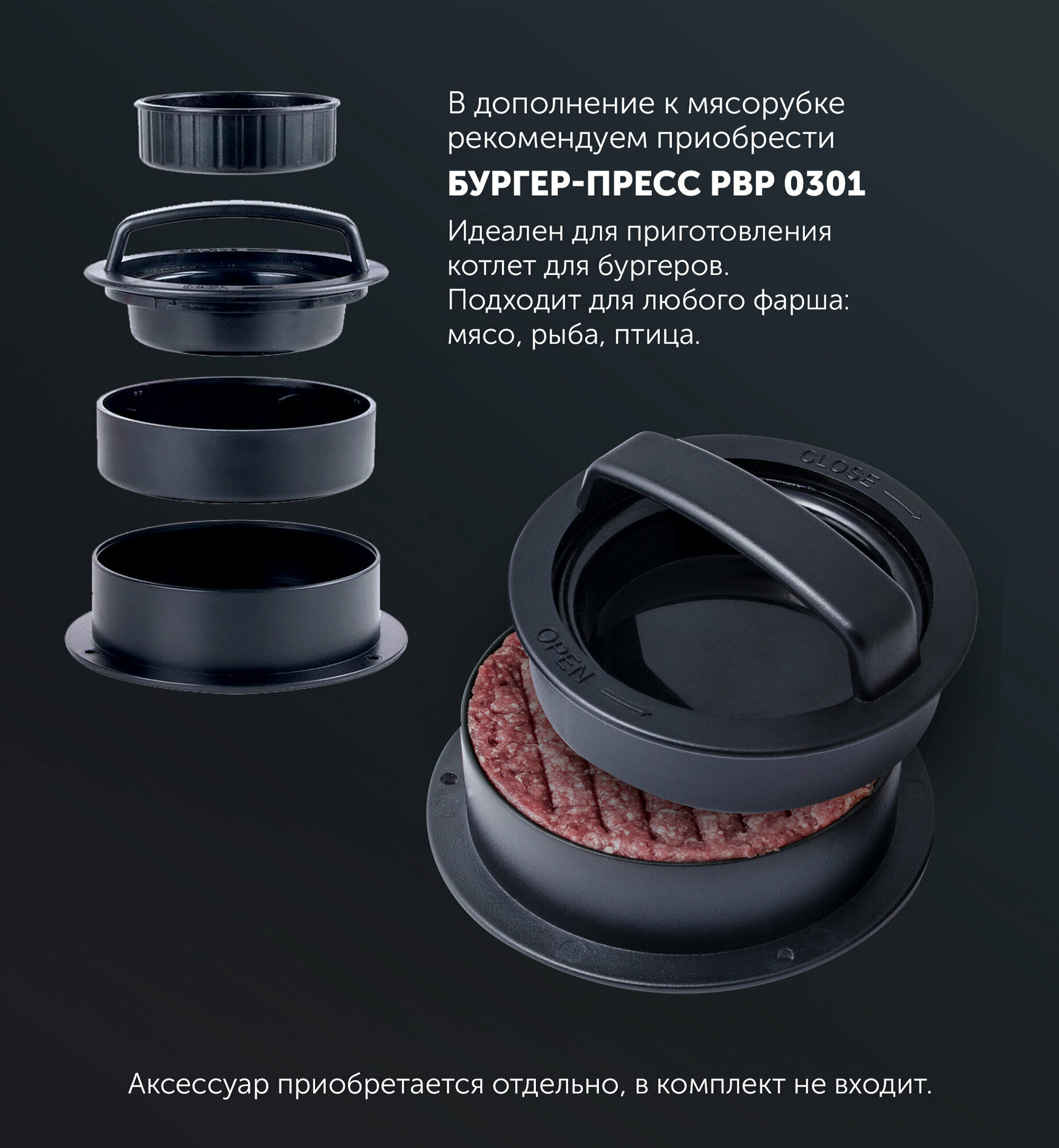 | Плюсы: | Выглядит стильно. Перемалывает мясо крайне быстро. С реверсом удобно. В комплекте также три насадки для овощей. |