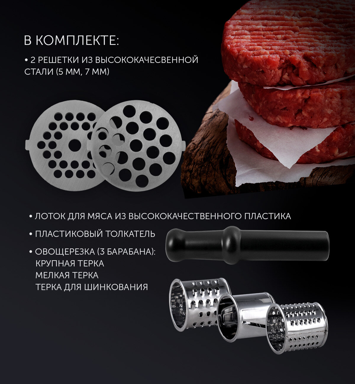 1) 2 решётки для фарша разной текстуры 2) 3 тёрки для овощей: 1. крупная 2. мелкая 3. для шинкования Быстро мелет фарш и трёт овощи. Я часто делаю заготовки впрок для заморозки. |