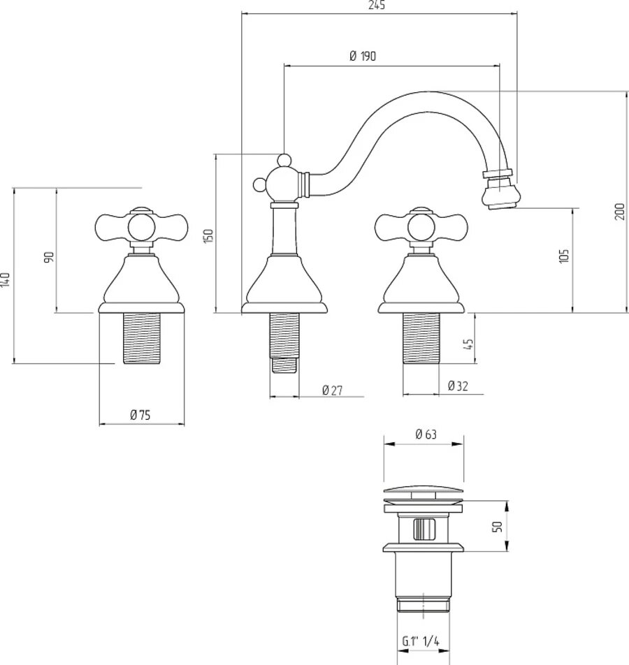 Смеситель для биде на 3 отв., донный клапан "click-clack", бел. с декором/хром Migliore Provance 19469