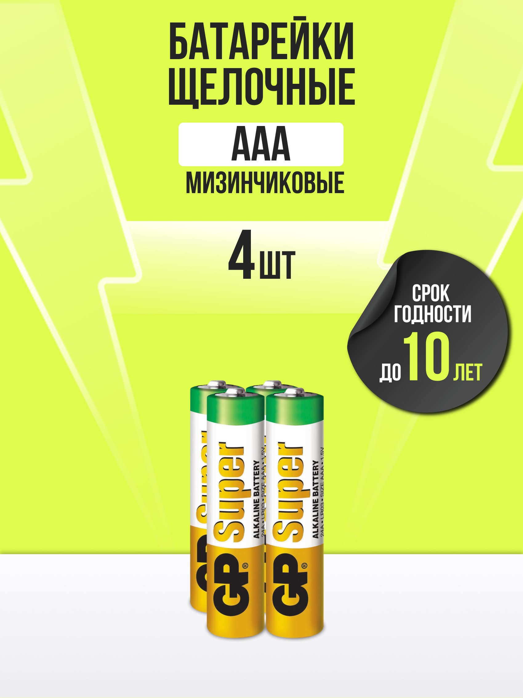 Купить Батарейки комплект 4 шт., GP Super, AAA (LR03, 24А), алкалиновые, мизинчиковые, в пленке, 24ARS-2SB4 (цена за 1 ед.товара)