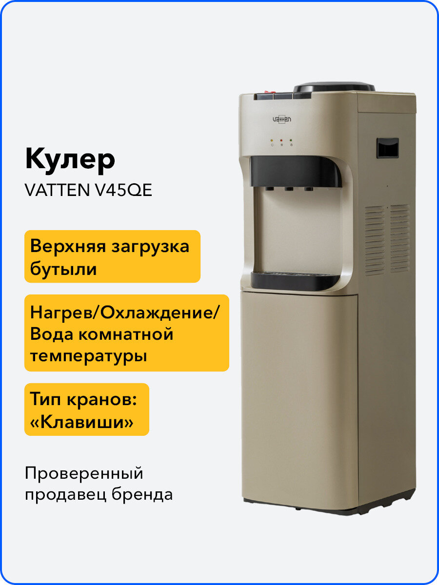 Ниже Вы можете прочитать отзывы на Кулер для воды Vatten V45QE, золотистый, ознакомится с подробными характеристиками, посмотреть интересные обзоры и фотографии на Кулер для воды Vatten V45QE, золотистый.
