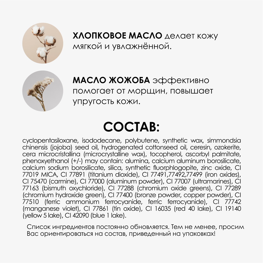 | Отзыв: | Очень мягкий, слишком светлый, блёстки в составе, мне не очень понравился, из-за того, что мягкий, быстро стирается или впитывается, после пары часов практически не виден |