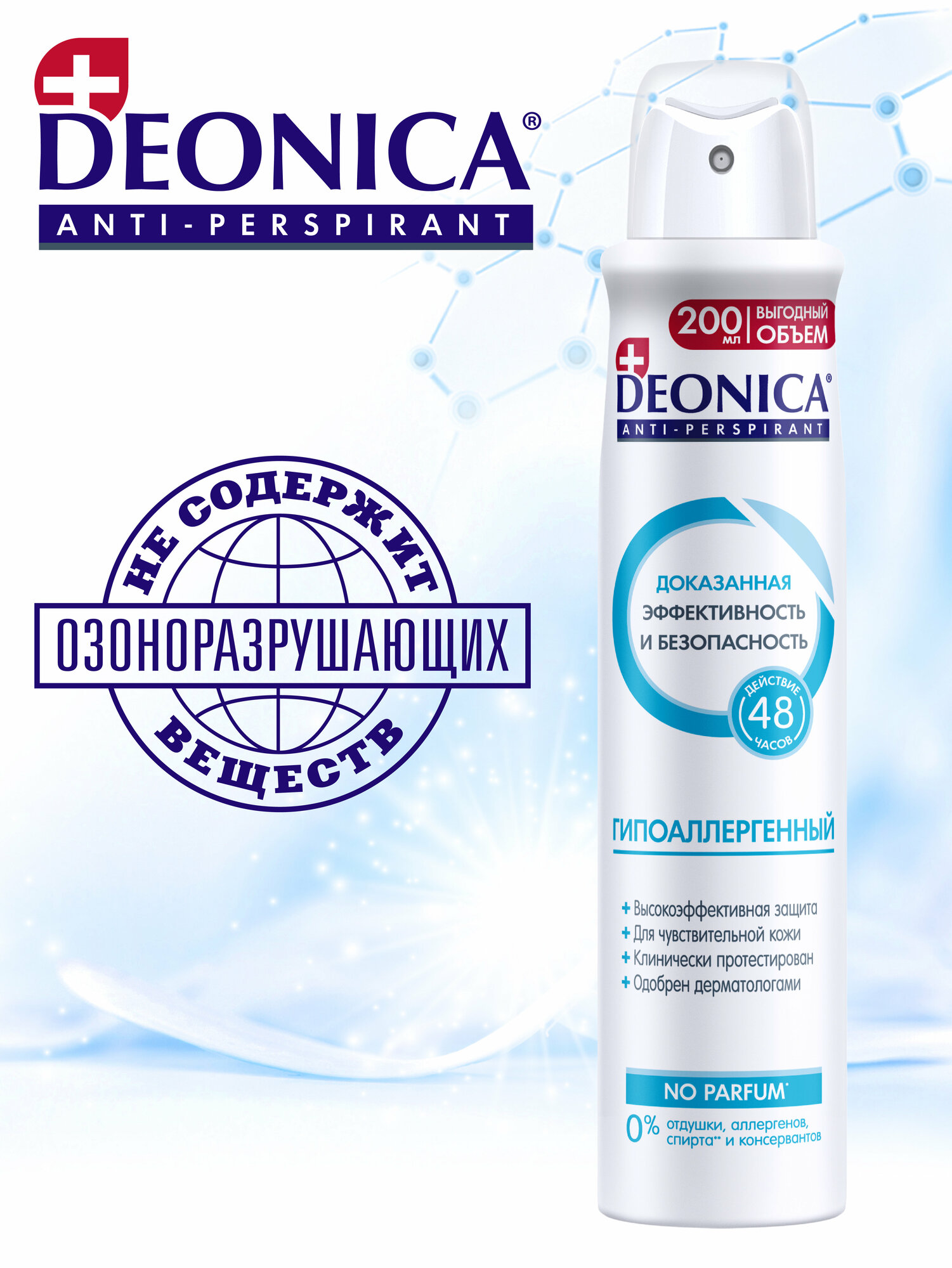 Дезодорант женский антиперспирант Deonica "Гипоаллергенный". Спрей, 200 мл. Без запаха. Не вызывает раздражения кожи