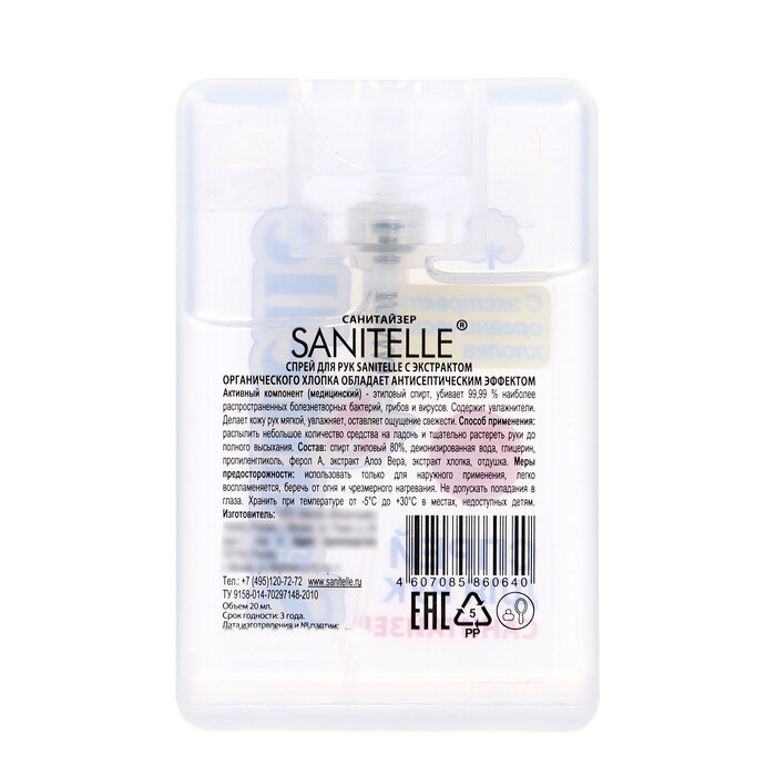 SANITELLE Антисептик для рук SANITELLE хлопок спрей 20 мл 0020-ИП