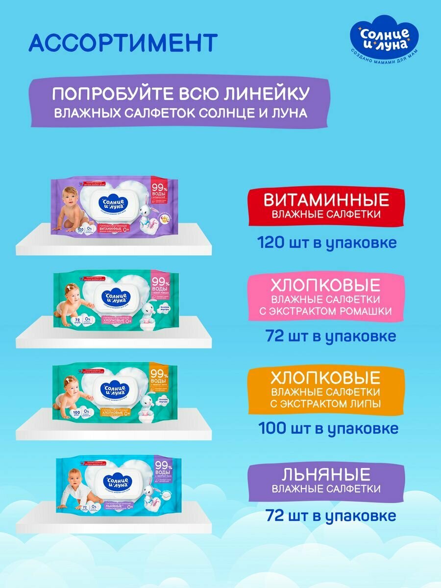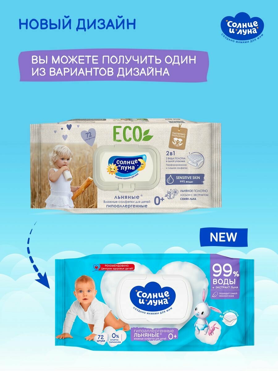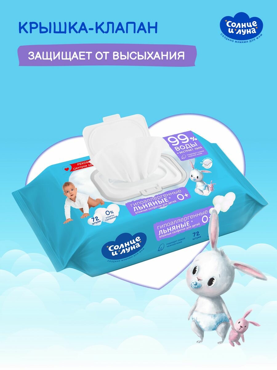 Влажные салфетки для детей Солнце и Луна, льняные, 0+, 72шт