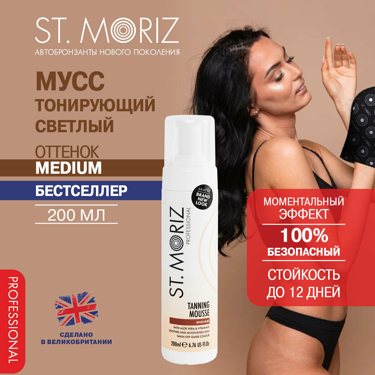 St.Moriz Автобронзант мусс тонирующий профессиональный, естественный бронзовый загар, автозагар для тела и лица, бронзатор, светлый оттенок, 200 мл