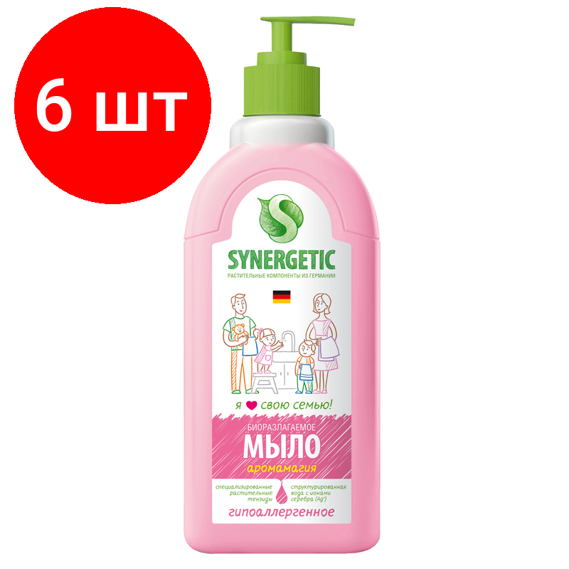 Комплект 6 шт, Мыло жидкое Synergetic "Аромамагия", биоразлагаемое, с дозатором, 500мл