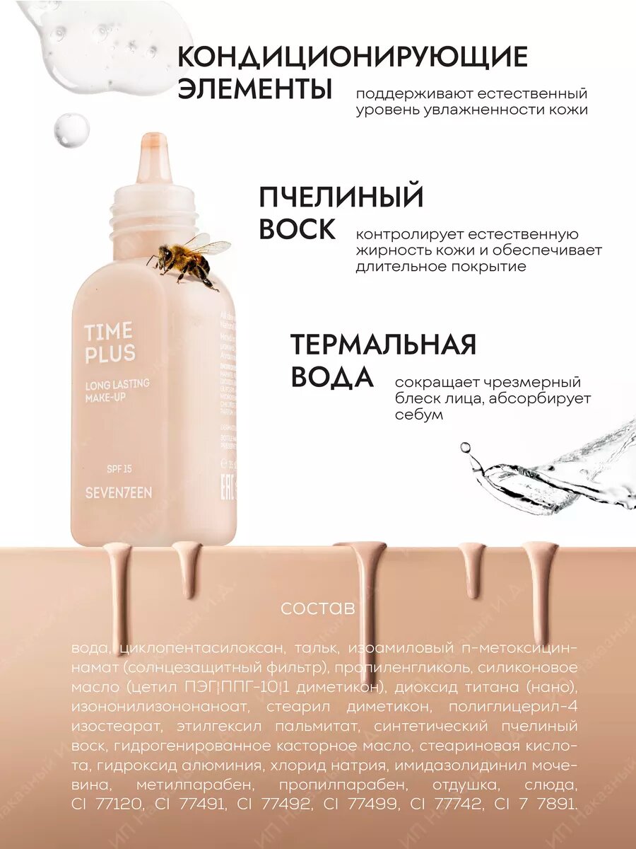 Seventeen / Севентин Тональный крем для лица Time Plus Long Lasting Make-Up для любого типа кожи оттенок 03 Натуральный бежевый с пчелиным воском 35мл