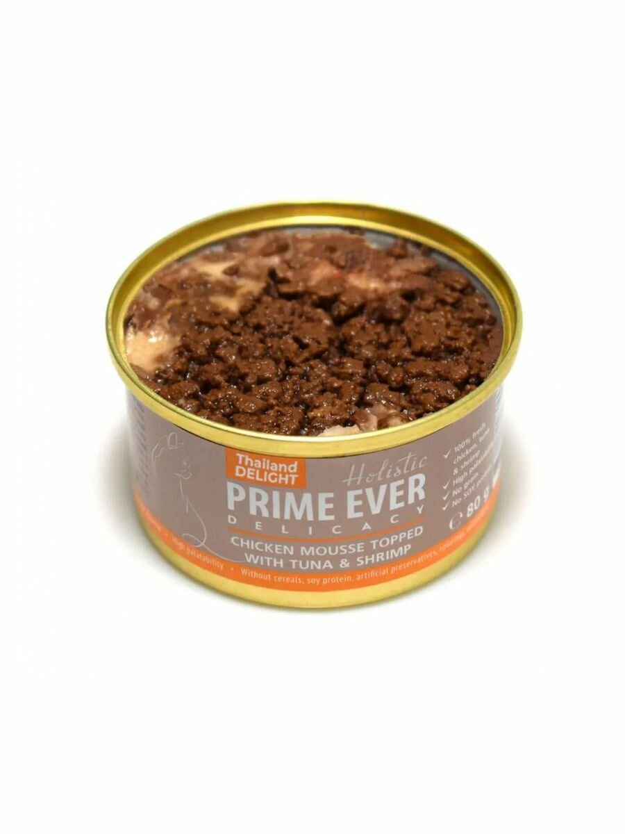 Купить Влажный корм для кошек Prime Ever 1A Delicacy консервы курица,тунец,креветки мусс,упаковка 80г*24 шт