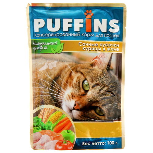 PUFFINS для взрослых кошек сочные кусочки с курицей в желе (100 гр х 24 шт)