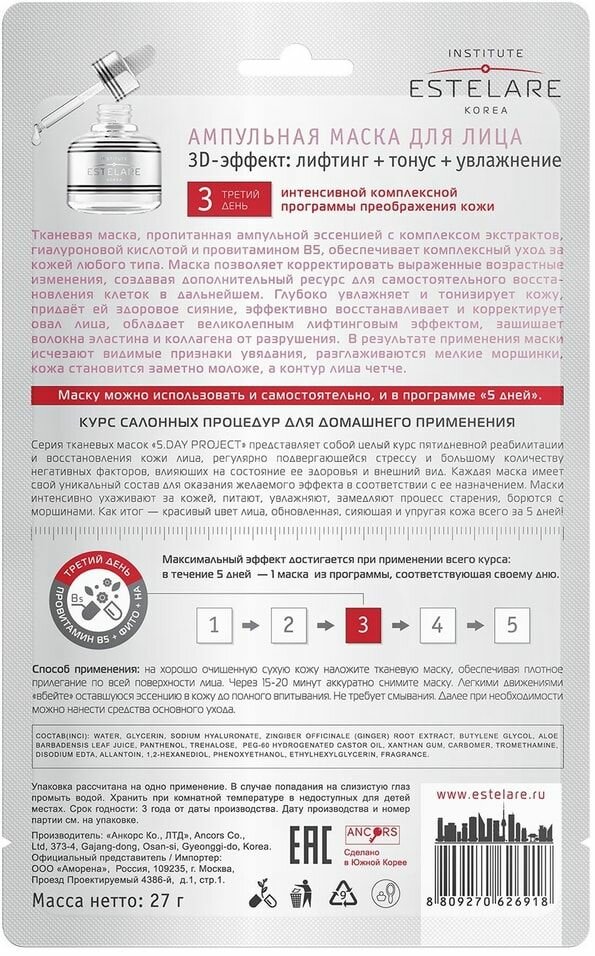 Ампульная маска (5дней) для лица 3 день"3D эффект Лифтинг+Тонус+Увлажнение", 27 г