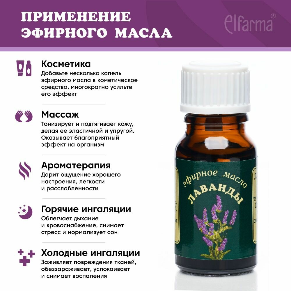 LAVANDULA OFFICINALIS Эфирное масло лаванды (100% натуральное), Эльфарма, 10 мл. интересное: