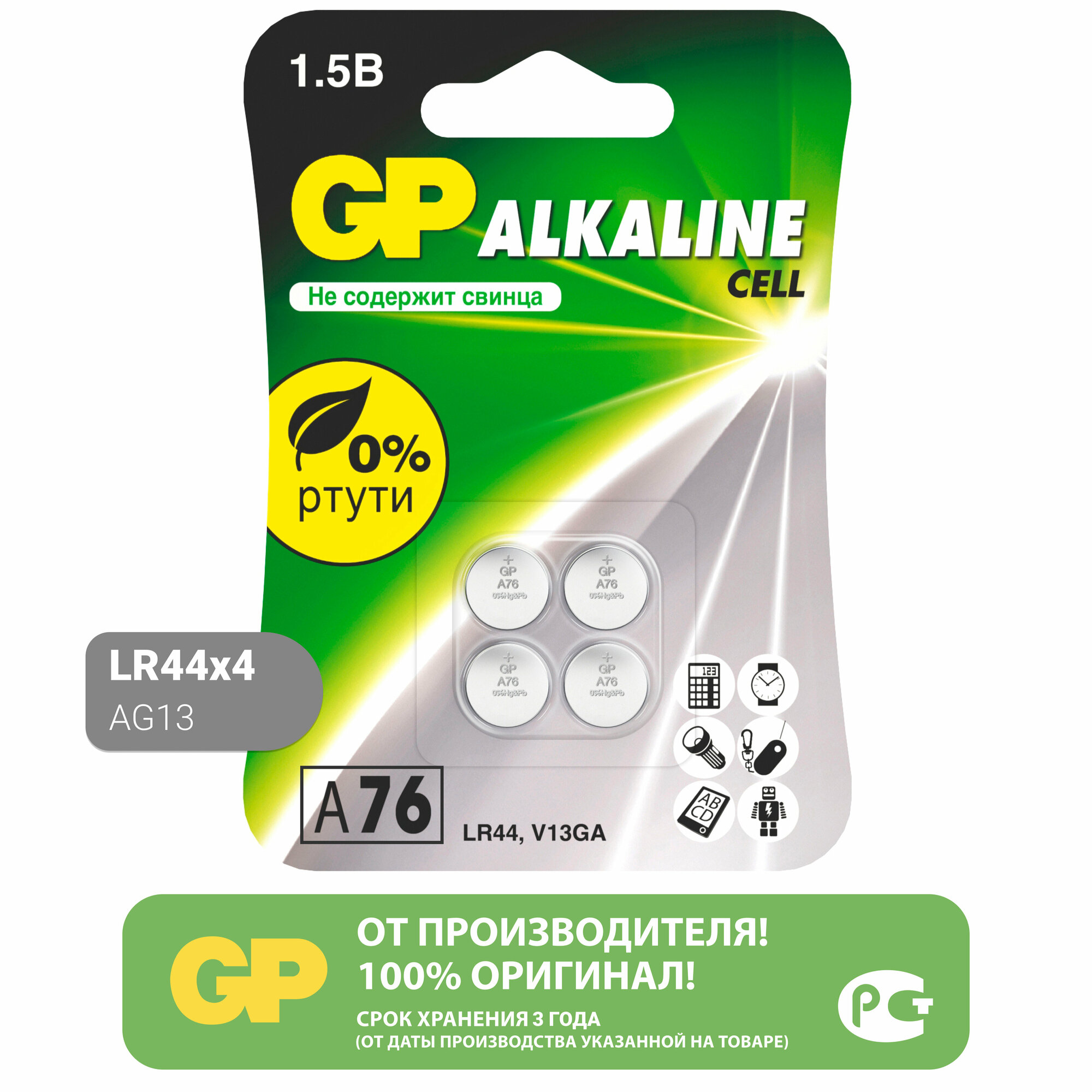 Алкалиновые пуговичные батарейки GP A76 - 4 шт. в блистере