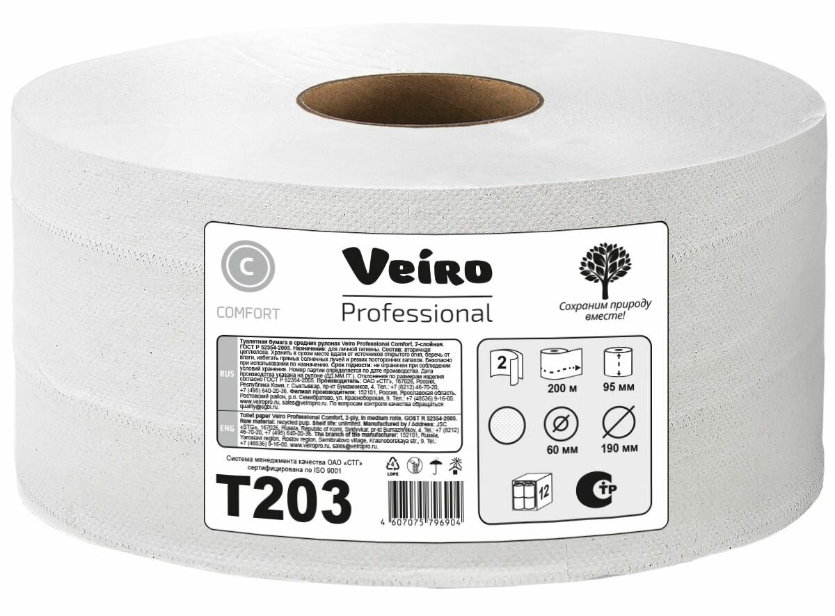 T203 Туалетная бумага в средних рулонах Veiro Professional Comfort двухслойная (12 рул х 200 м)