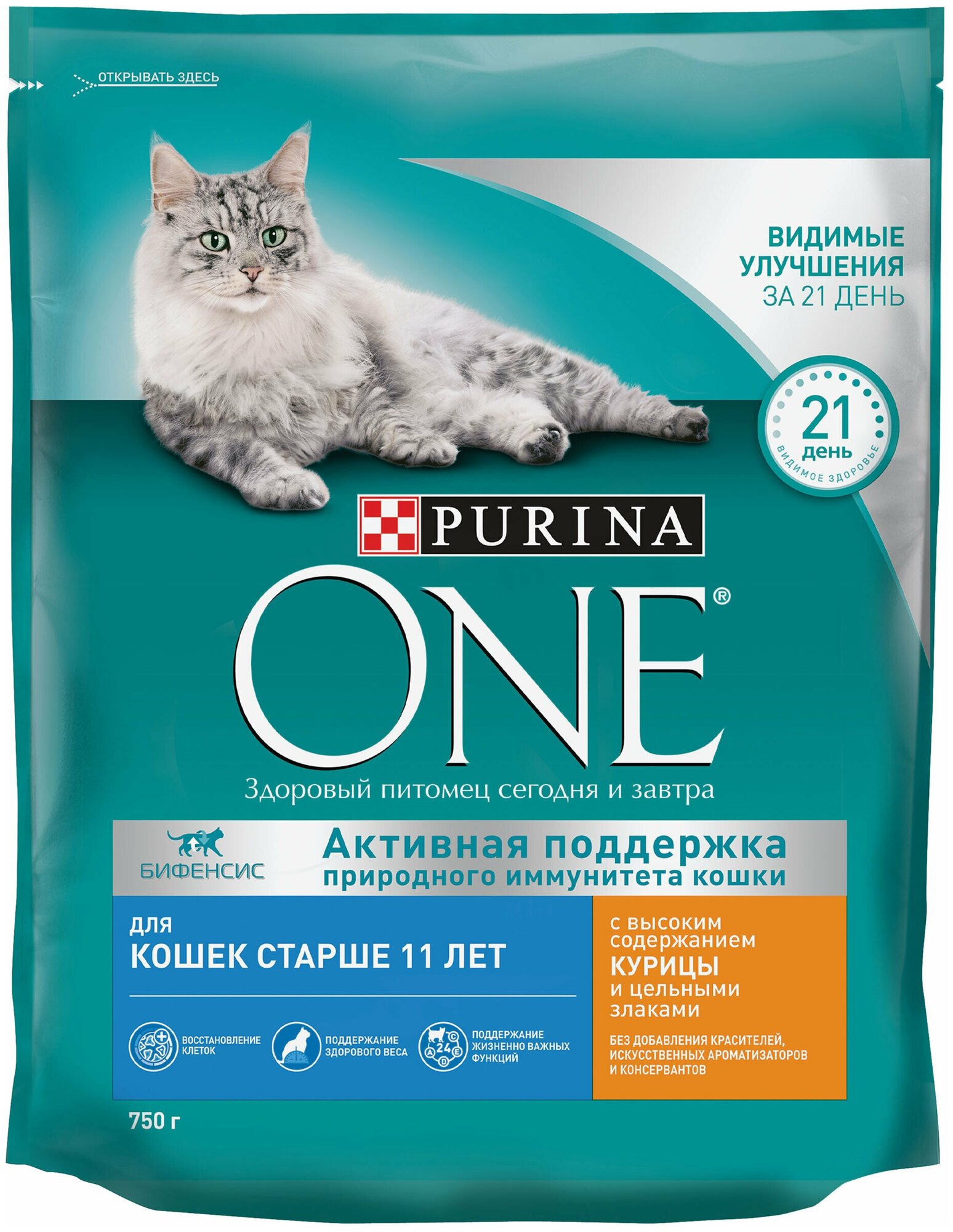 Сухой корм Purina ONE для кошек старше 11 лет с курицей и цельными злаками, Пакет, 750 г,Для взрослых кошек старше 11 лет