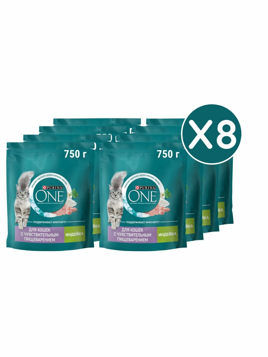 Купить Сухой корм для кошек, Purina ONE Sensitive при чувствительном пищеварении, с индейкой и рисом, 750г 8 шт