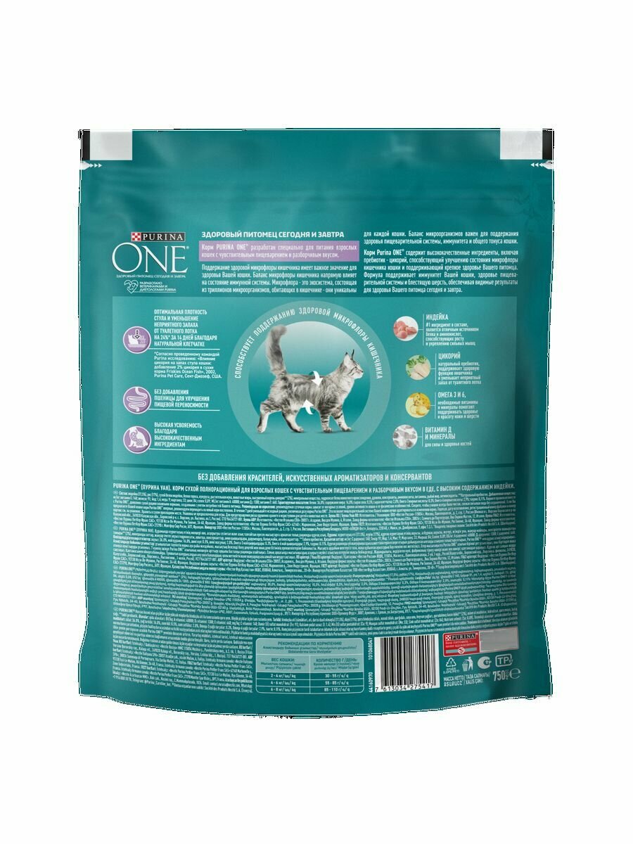 PURINA ONE 750 г сухой корм для взрослых кошек с чувствительным пищеварением и разборчивым вкусом в еде, с высоким содержанием индейки и рисом