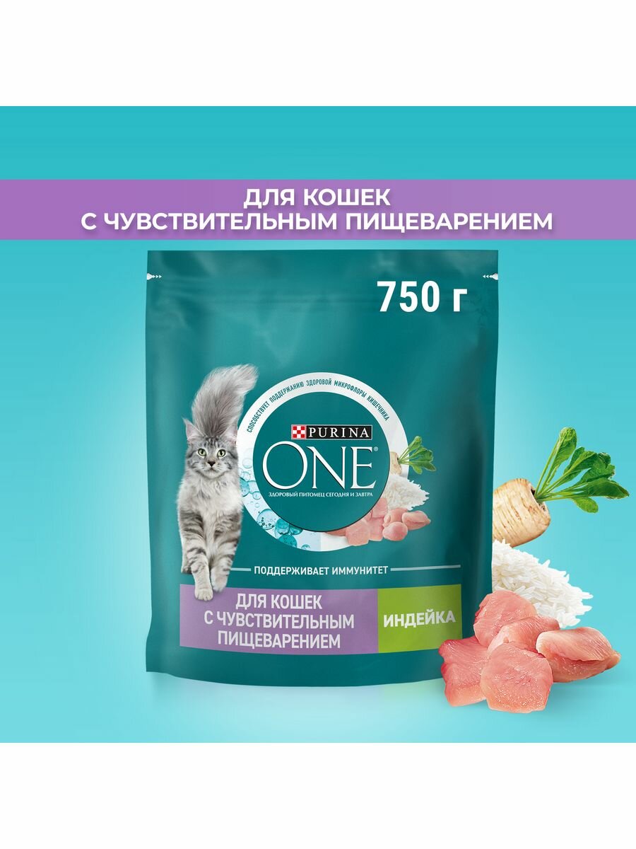 Сухой корм Purina ONE для кошек с чувствительным пищеварением с индейкой и рисом, пакет, 750 г