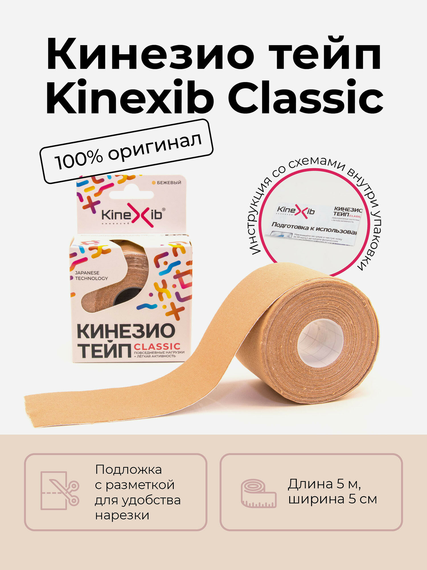 Kinexib Classic / Кинексиб Классик - кинезио тейп для повседневного использования, бежевый, 5 см x 5 м