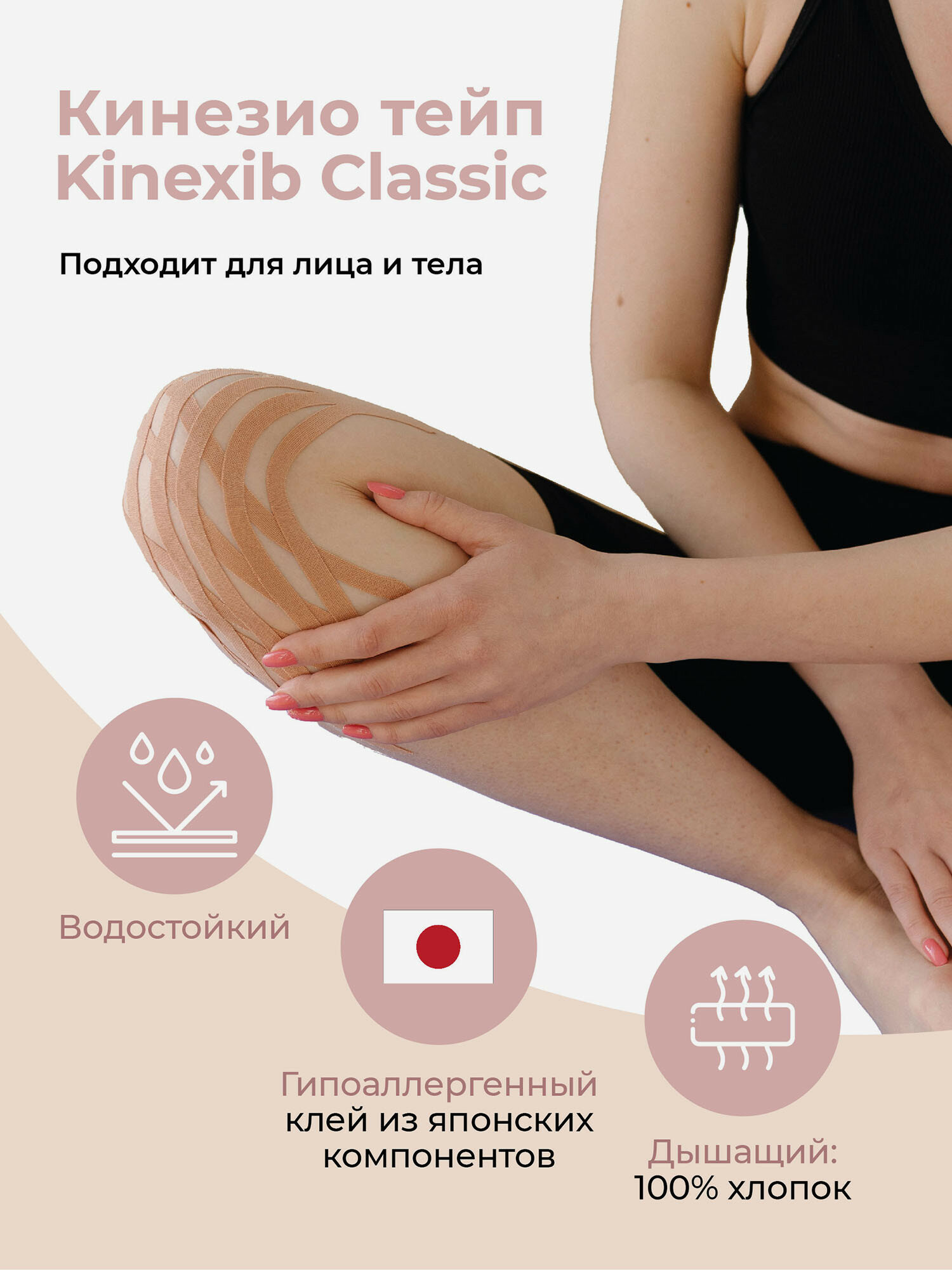 Кинезио тейп Kinexib CLASSIC, тейпы для тела, тейп для лица 5м*5см, бежевый