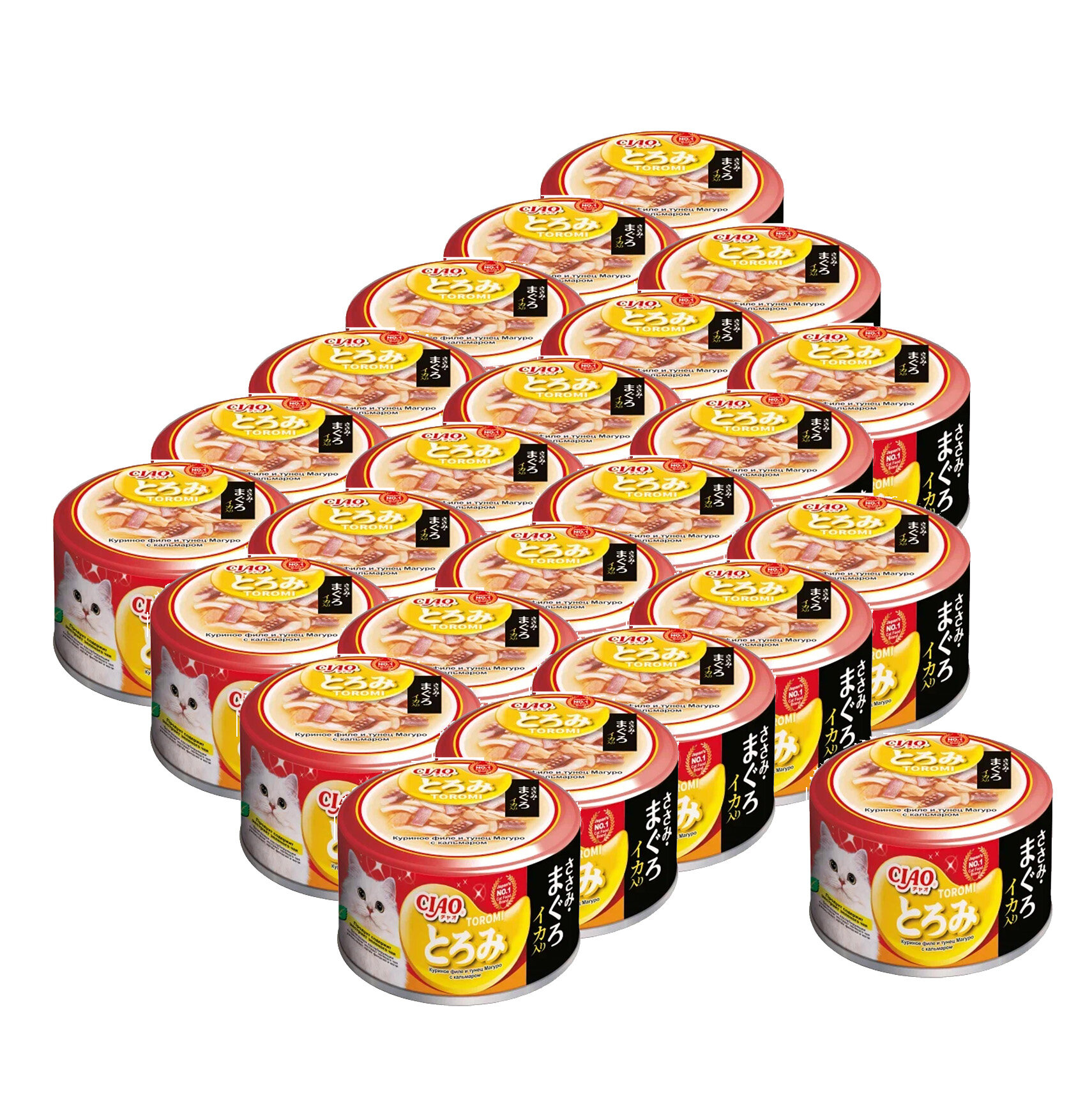 Купить INABA Ciao Toromi 80 г консервы для кошек куриное филе, тунец магуро и кальмар в бульоне 24 шт