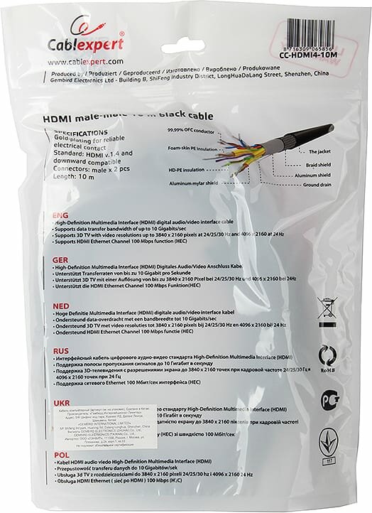 Кабель HDMI - HDMI, М/М, 10 м, v2.0, поз.р, экр, Cablexpert, CC-HDMI4-10M