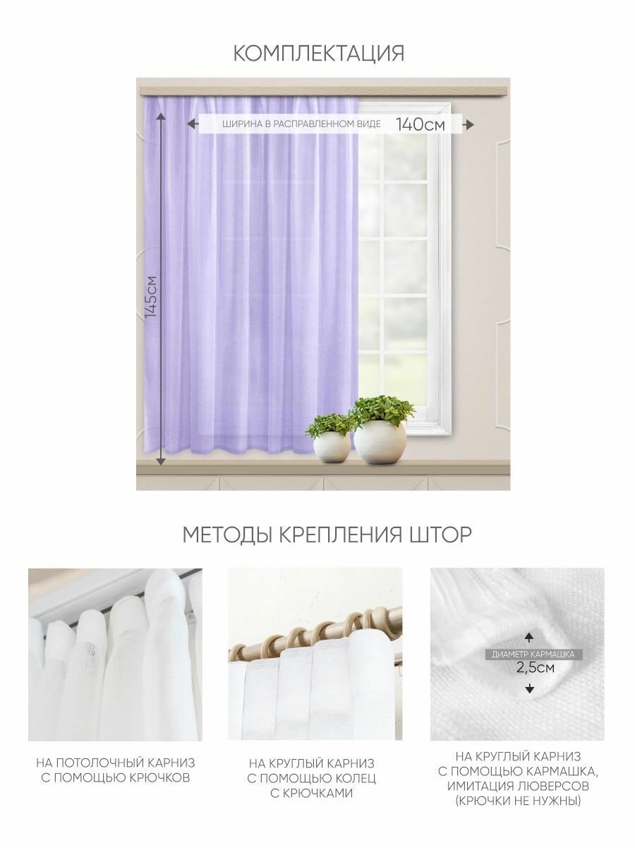 Штора на кухню короткая Witerra тюль для потолочного и круглого карнизов, 140х145 см, сирень, 1 шт.