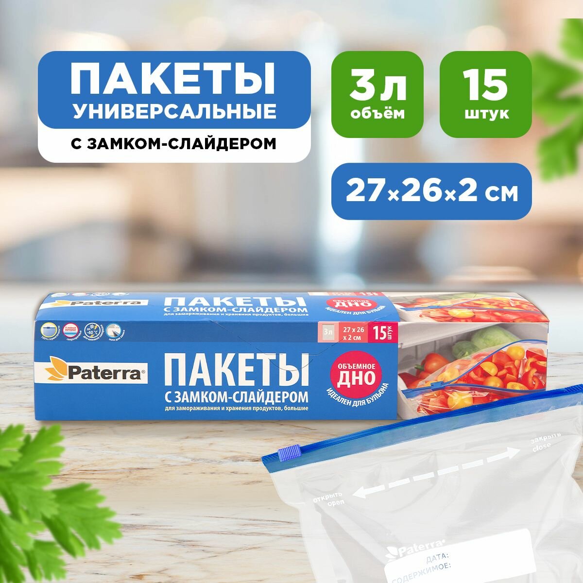 Пакеты для замораживания PATERRA 15шт 3л 27 26 2см и для хранения со слайдером
