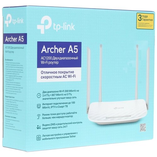СохранитьРоутер WiFi TP-LINK Archer A5 до 867 Мбит/с на 5 ГГц + до 300 Мбит/с на 2,4 ГГц, 802.11ac/a/b/g/n, кнопка WPS, 5 100 Мбит/с портов, 4 фиксированных ан интересное: