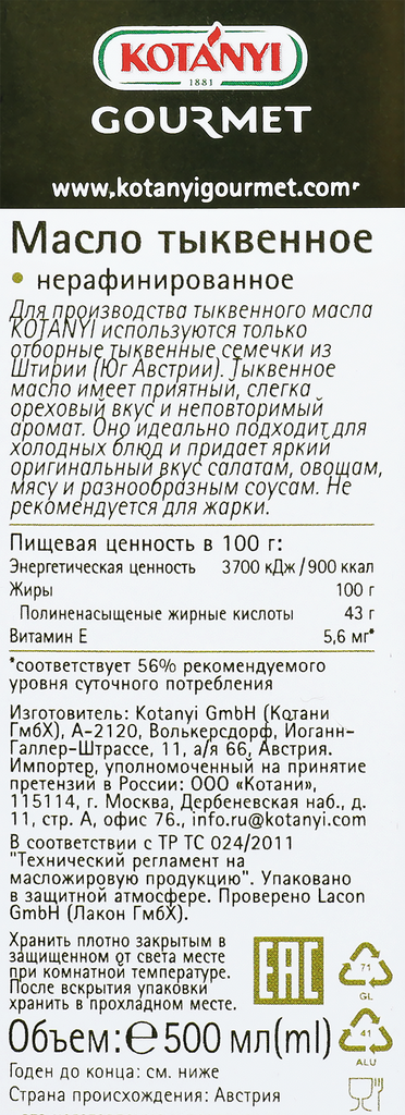 Масло тыквенное KOTANYI 500Г интересное: