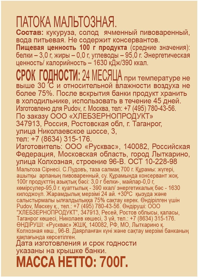 Патока мальтозная С. Пудовъ , 700 г интересное: