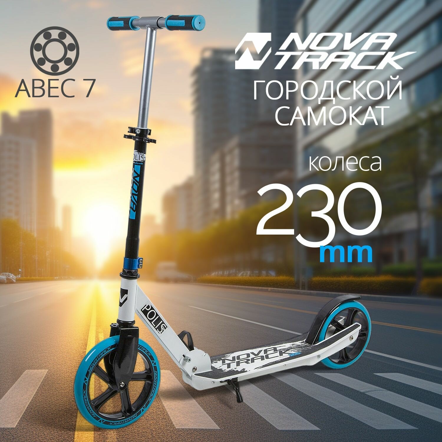 Самокат городской NOVATRACK 230P.POLIS.BL9 сталь+пластик, складной, ватер стикер, колеса 230*200 мм