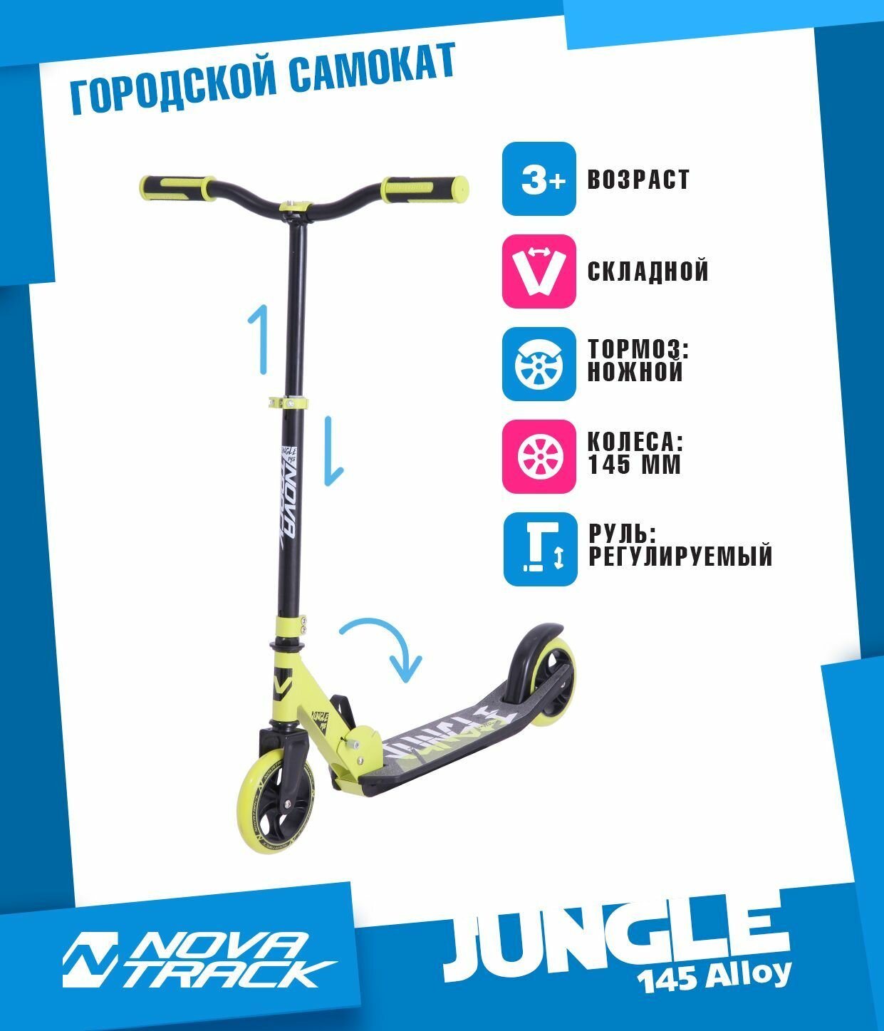 Самокат NOVATRACK JUNGLE 145 Pro (2019) (Самокат для детей NOVATRACK JUNGLE сталь+пластик, складной, эргономичный Y-руль с нескладными рукоят)