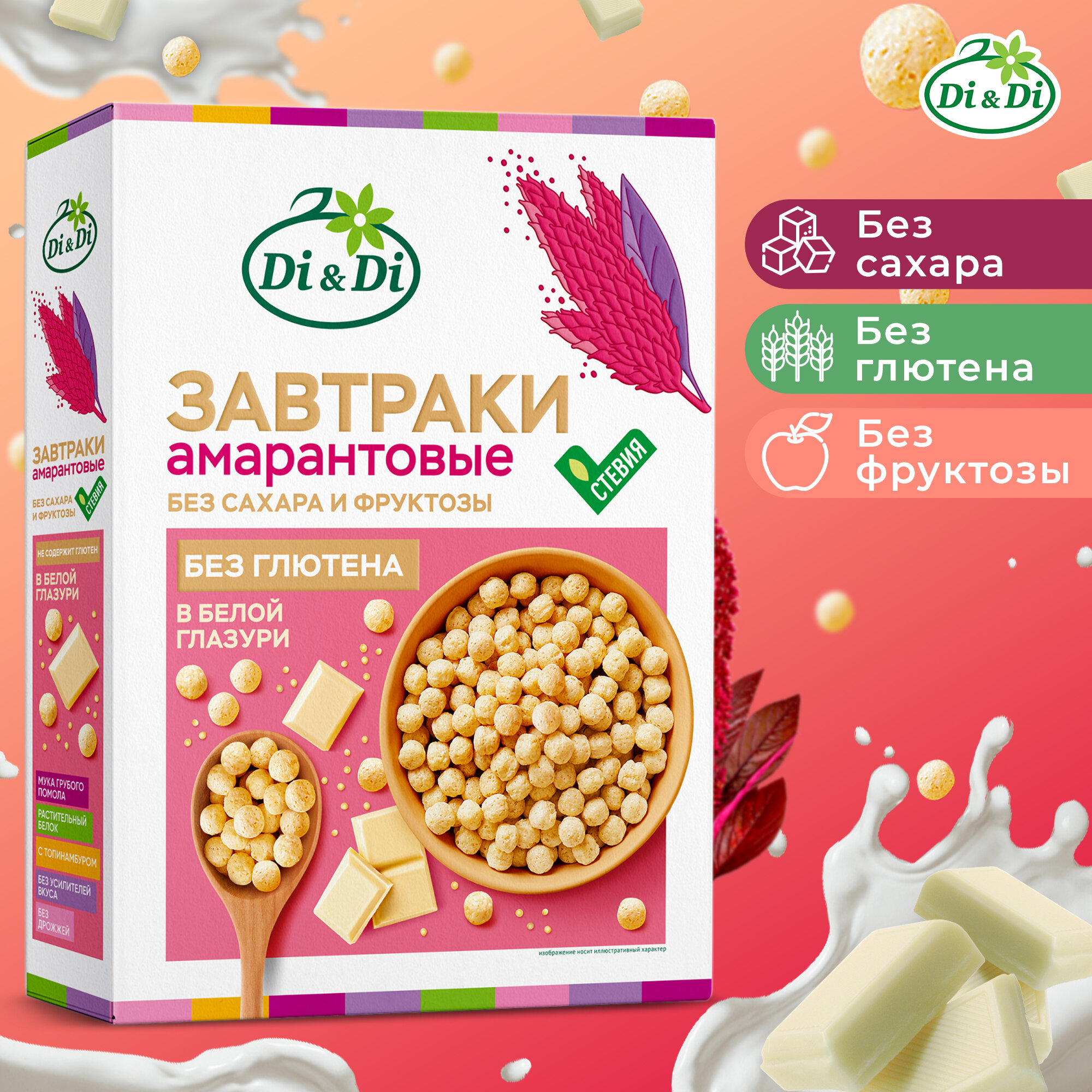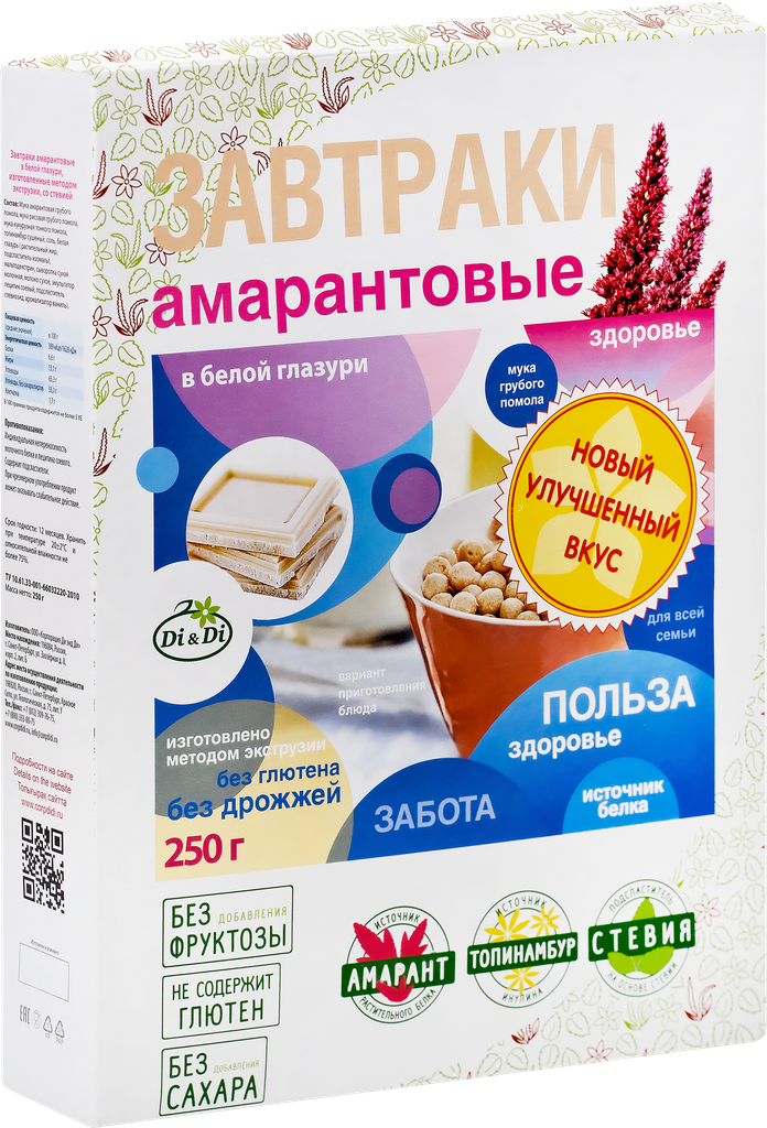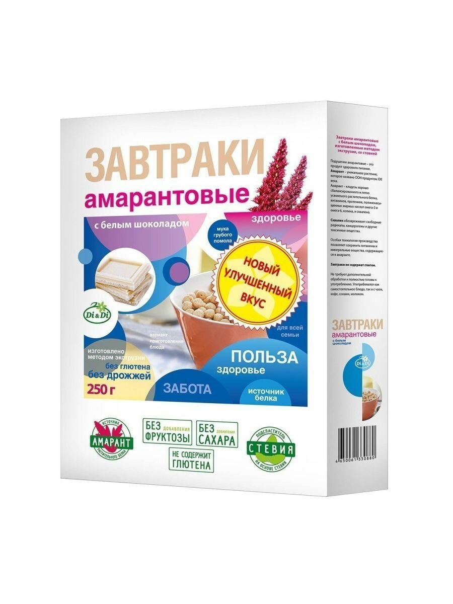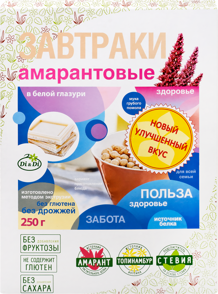 Готовый завтрак амарантовый Di&Di в белой глазури, без сахара, без глютена, 250г интересное: