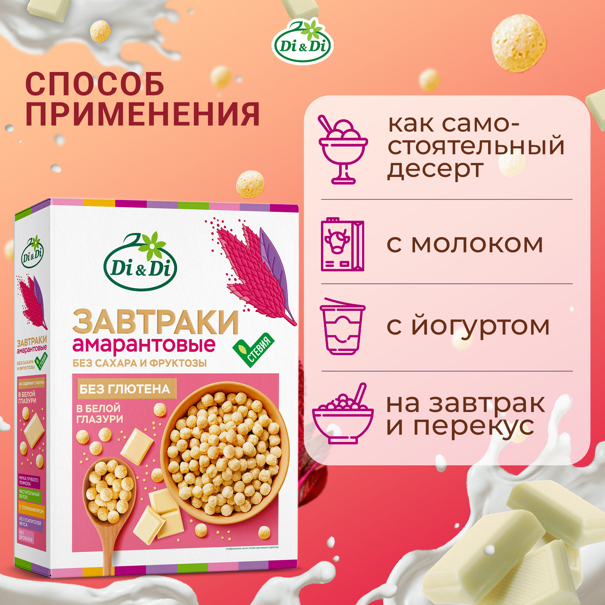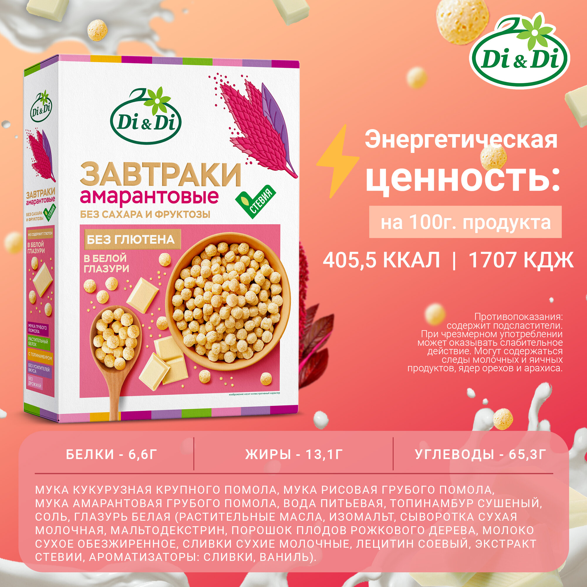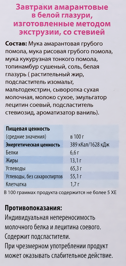 Готовый завтрак амарантовый Di&Di в белой глазури, без сахара, без глютена, 250г интересное: