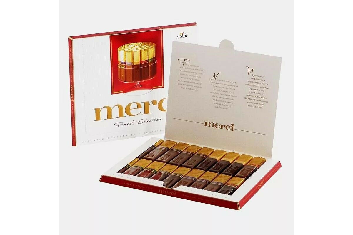 Merci, конфеты шоколадные в коробке, подарочный набор, ассорти, произведено в Германии, 250г