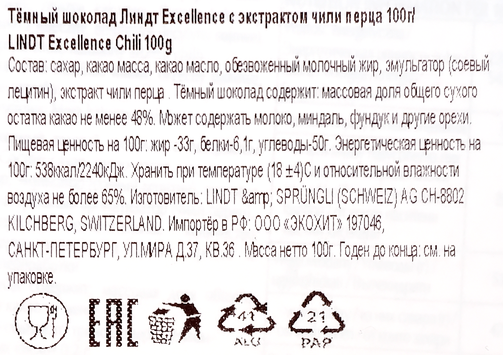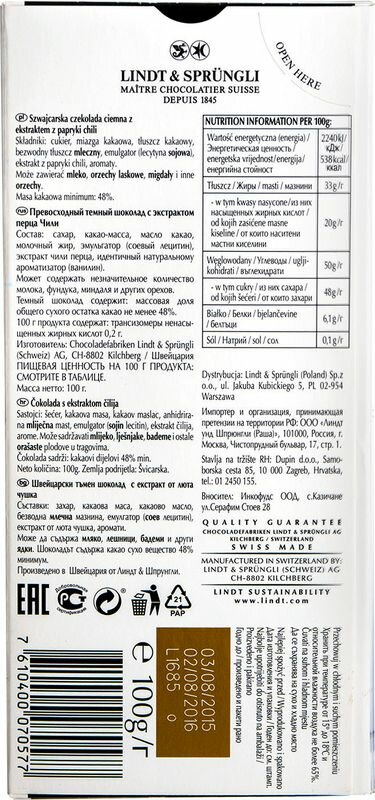 Шоколад LINDT темный с экстрактом перца чили, 100 гр интересное: