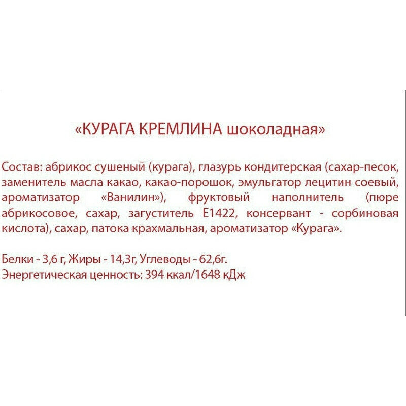 Ниже Вы можете прочитать отзывы на Конфеты кремлина Курага шоколадная, 190г, ознакомится с подробными характеристиками, посмотреть интересные обзоры и фотографии на Конфеты кремлина Курага шоколадная, 190г.