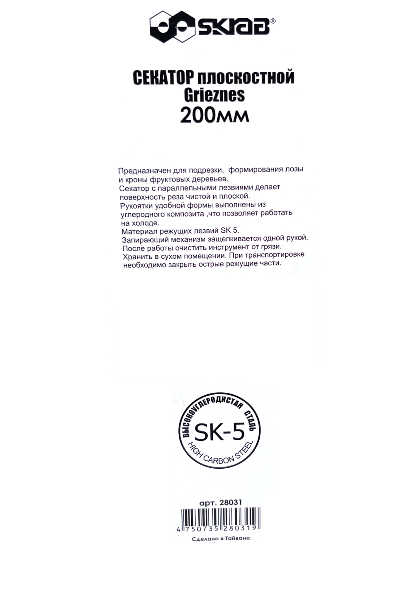 Секатор садовый плоскостной 200 мм, SK5. Skrab 28031